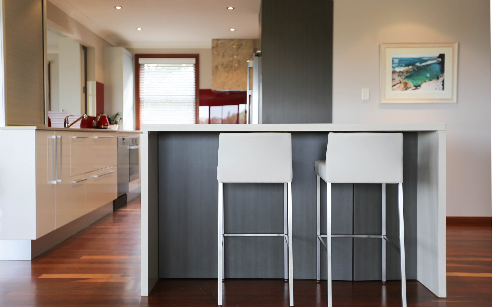 Joinery Design: Accent lighting, hardwood floors and bold pops of red accentuate seamless joinery and finishes.